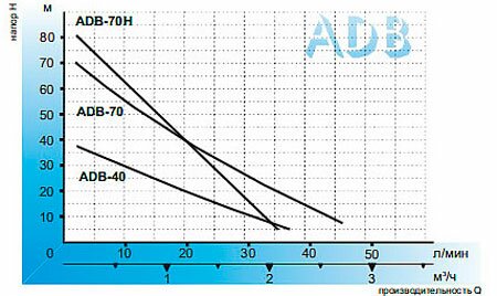 | ADB-40 | 0,5 | 0,37 | напор Н, м | 40 | 36 | 31,5 | 22 | 12 | 2 | - | до 7 | 1" | 1" |