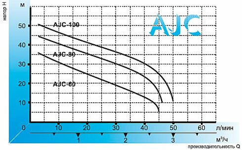 | AJC-60C | 0.6 | 0,45 | напор Н, м | 38 | 34 | 26 | 18 | 5 | - | - | - | - | до 8 | 1" | 1" |